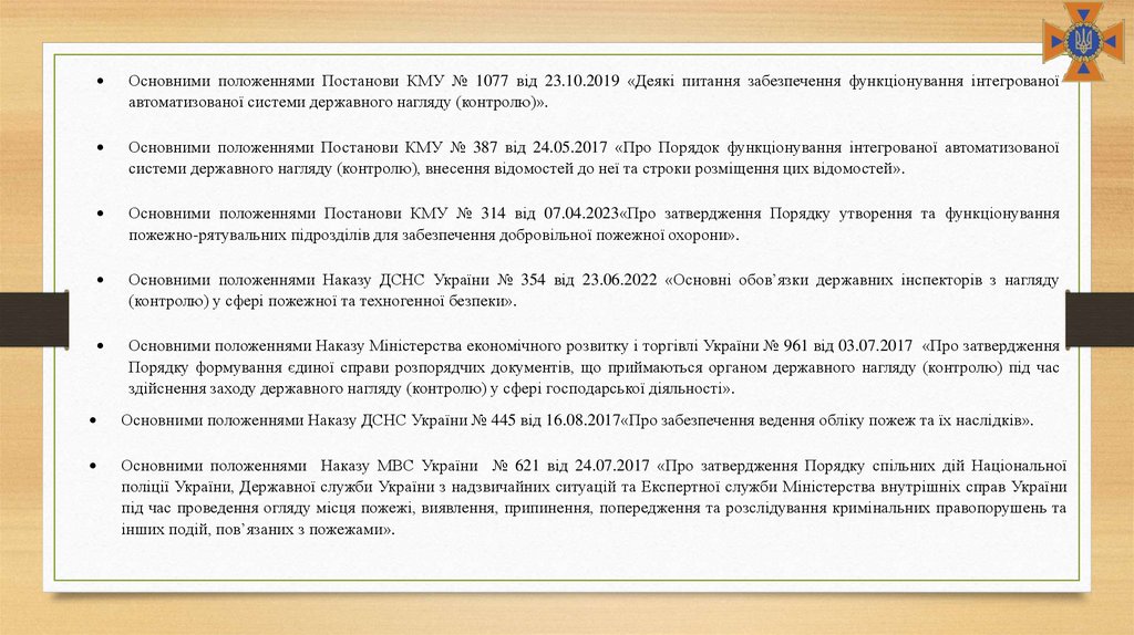 Основними положеннями Постанови КМУ № 1077 від 23.10.2019 «Деякі питання забезпечення функціонування інтегрованоїавтоматизованої системи державного нагляду (контролю)».