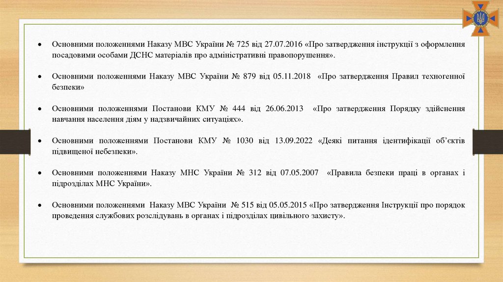 Основними положеннями Наказу МВС України № 725 від 27.07.2016 «Про затвердження інструкції з оформленняпосадовими особами ДСНС матеріалів про адміністративні правопорушення».