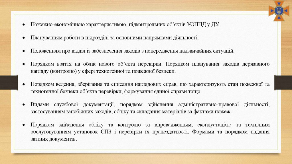 Пожежно-економічною характеристикою підконтрольних об’єктів УОППД у ДУ.Плануванням роботи в підрозділі за основними напрямками діяльності.