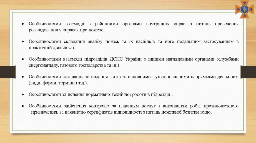 Особливостями взаємодії з районними органами внутрішніх справ з питань проведеннярозслідування у справах про пожежі.