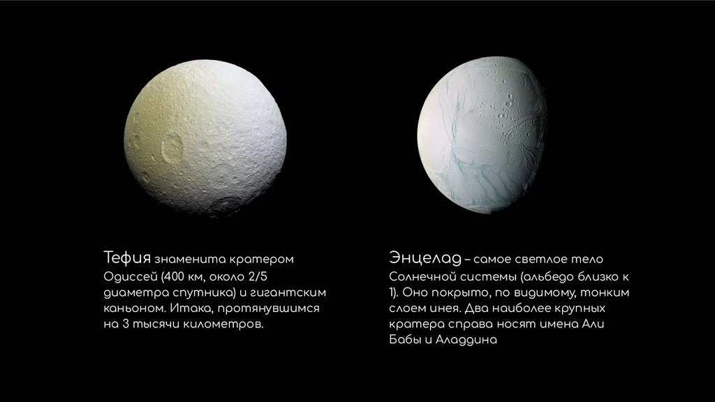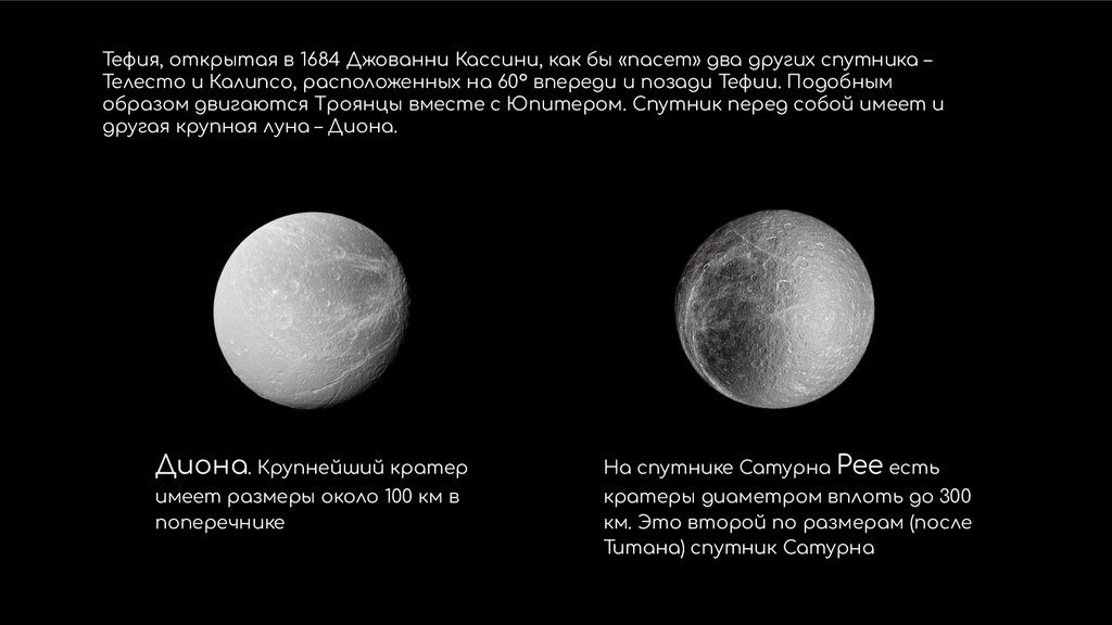 Тефия, открытая в 1684 Джованни Кассини, как бы «пасет» два других спутника –Телесто и Калипсо, расположенных на 60° впереди и позади Тефии. Подобным
