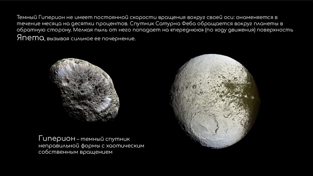 Темный Гиперион не имеет постоянной скорости вращения вокруг своей оси: онаменяется втечение месяца на десятки процентов. Спутник Сатурна Феба обращается вокруг планеты в