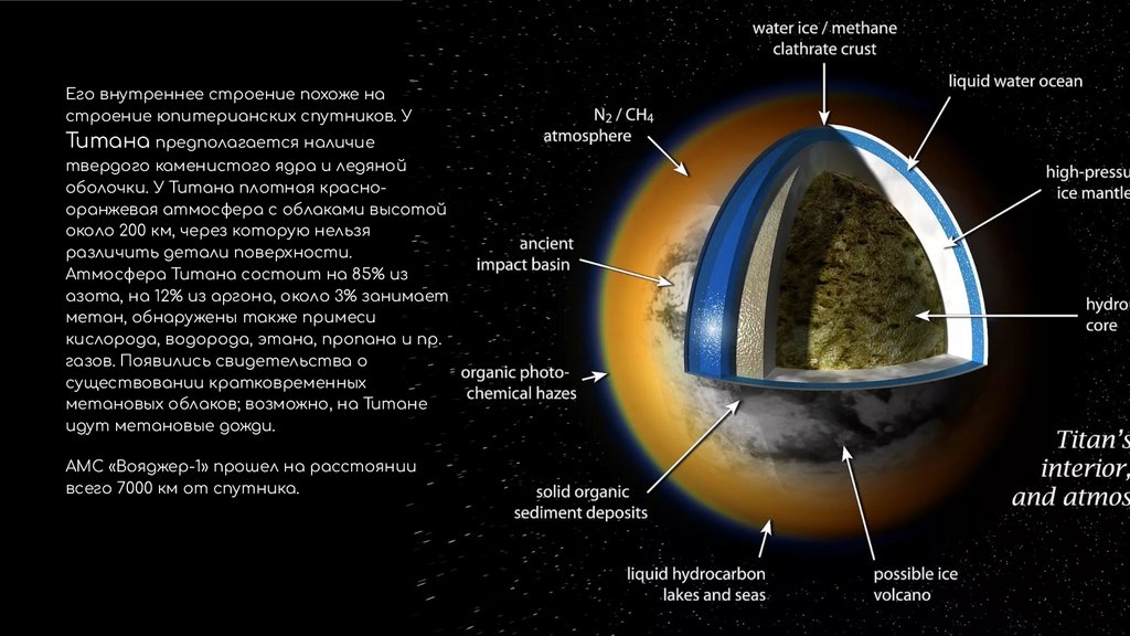 оболочки. У Титана плотная краснооранжевая атмосфера с облаками высотой