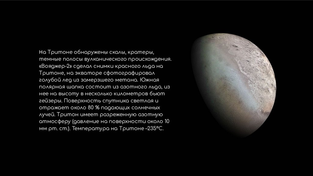 На Тритоне обнаружены скалы, кратеры,темные полосы вулканического происхождения.