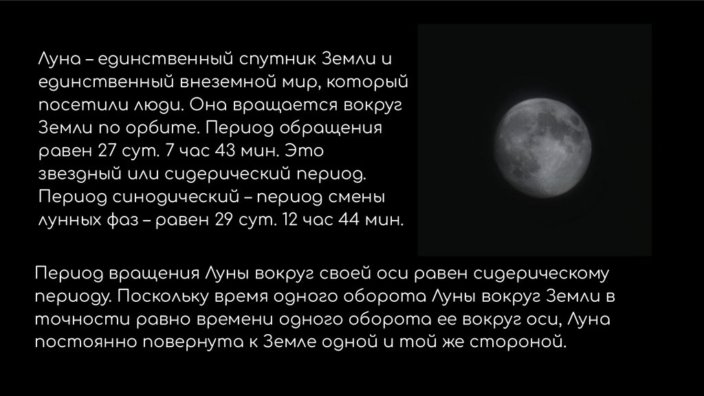 Период вращения Луны вокруг своей оси равен сидерическому