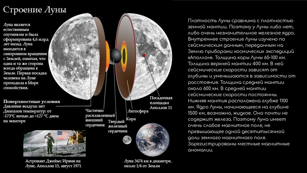 Плотность Луны сравнима с плотностьюземной мантии. Поэтому у Луны либо нет,