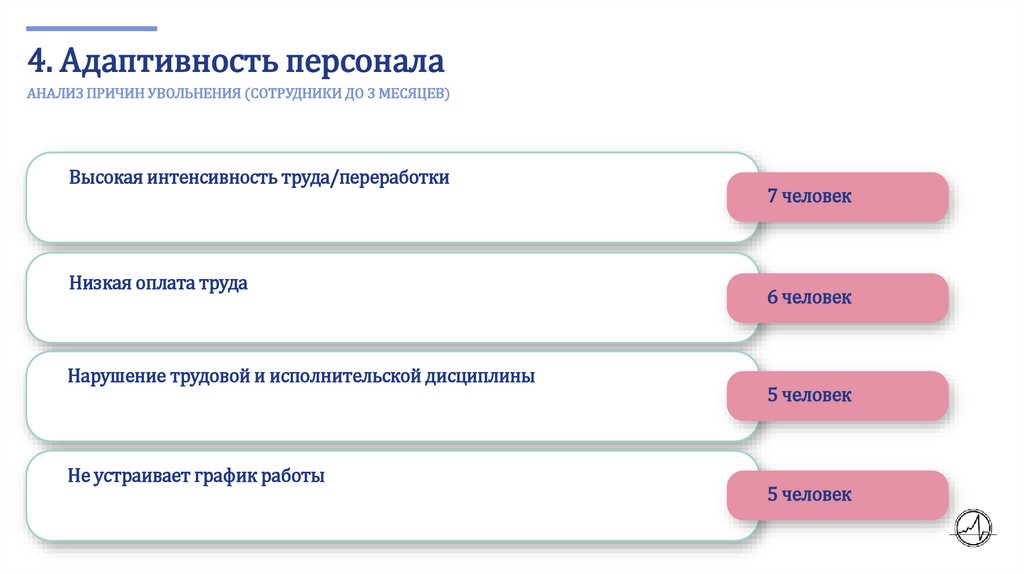 4. Адаптивность персоналаАНАЛИЗ ПРИЧИН УВОЛЬНЕНИЯ (СОТРУДНИКИ ДО 3 МЕСЯЦЕВ)