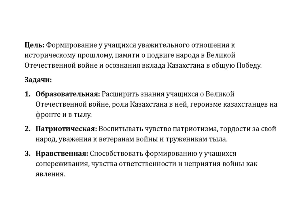 Отечественной войне и осознания вклада Казахстана в общую Победу.