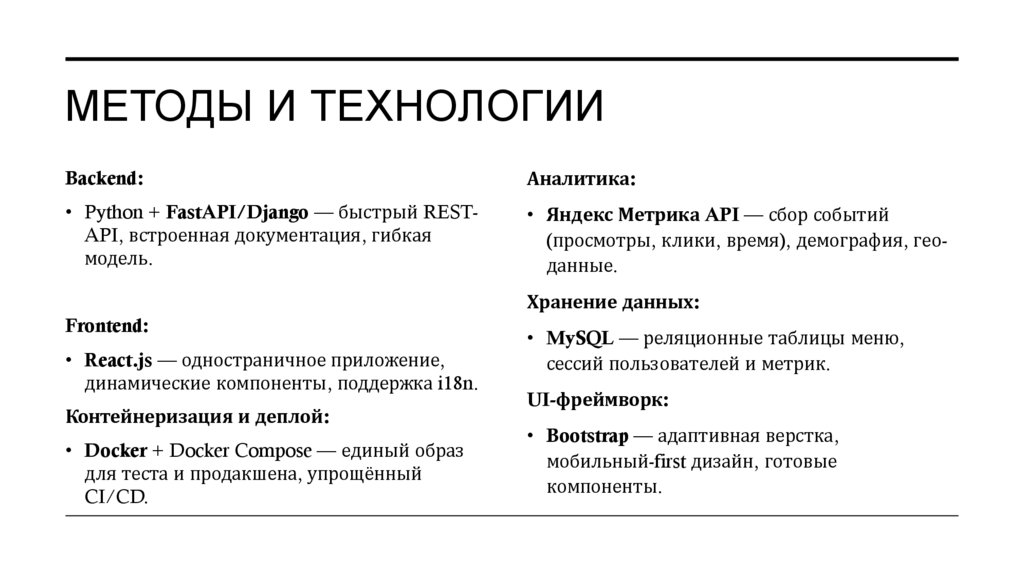 МЕТОДЫ И ТЕХНОЛОГИИBackend: