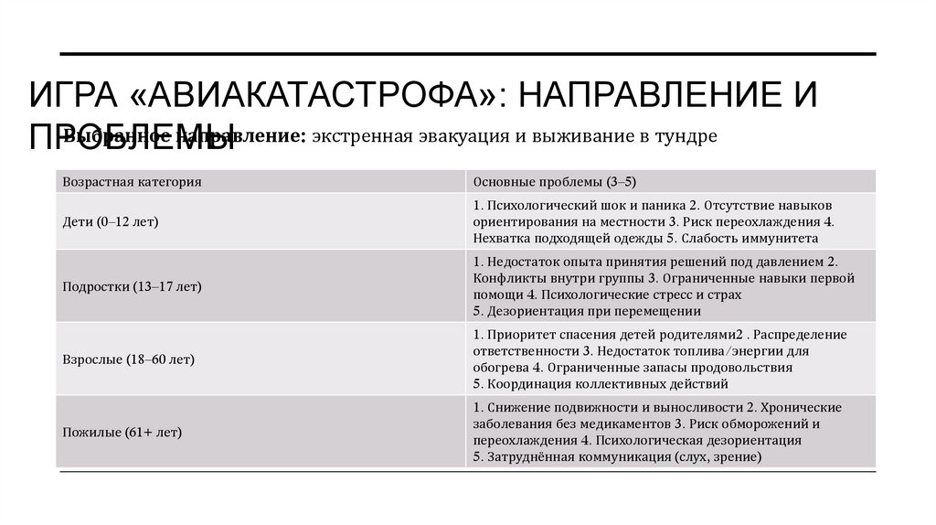 ИГРА «АВИАКАТАСТРОФА»: НАПРАВЛЕНИЕ ИВыбранное направление: экстренная эвакуация и выживание в тундре