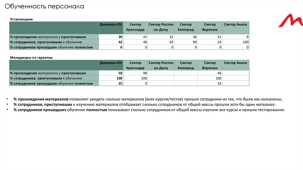% прохождения материалов позволяет увидеть сколько материалов (всех курсов/тестов) прошли сотрудники из тех, что были им назначены;