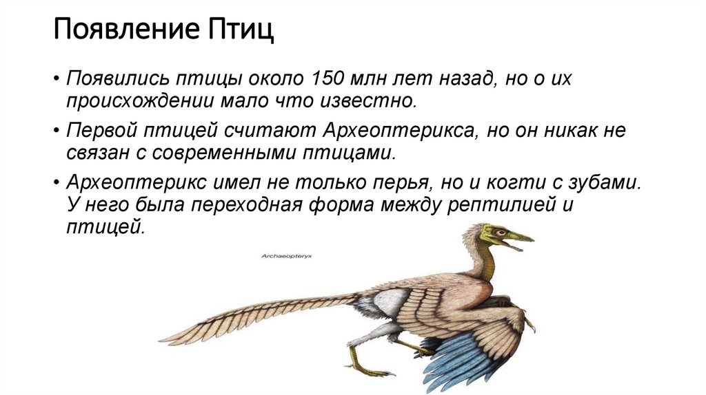 Появление Птиц• Появились птицы около 150 млн лет назад, но о их