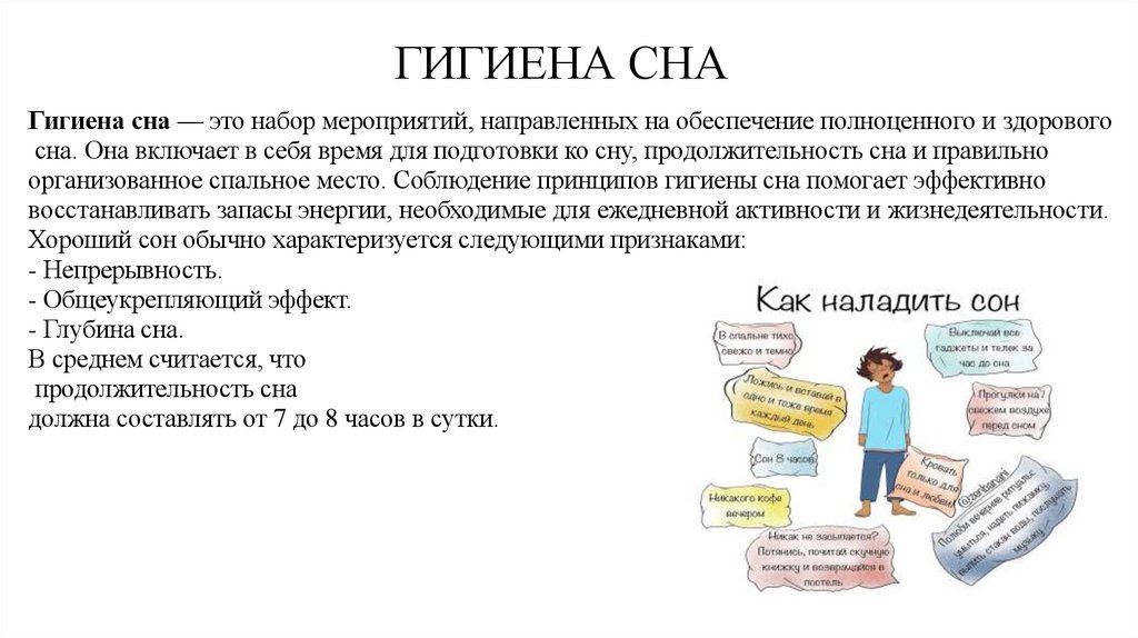 ГИГИЕНА СНАГигиена сна — это набор мероприятий, направленных на обеспечение полноценного и здорового