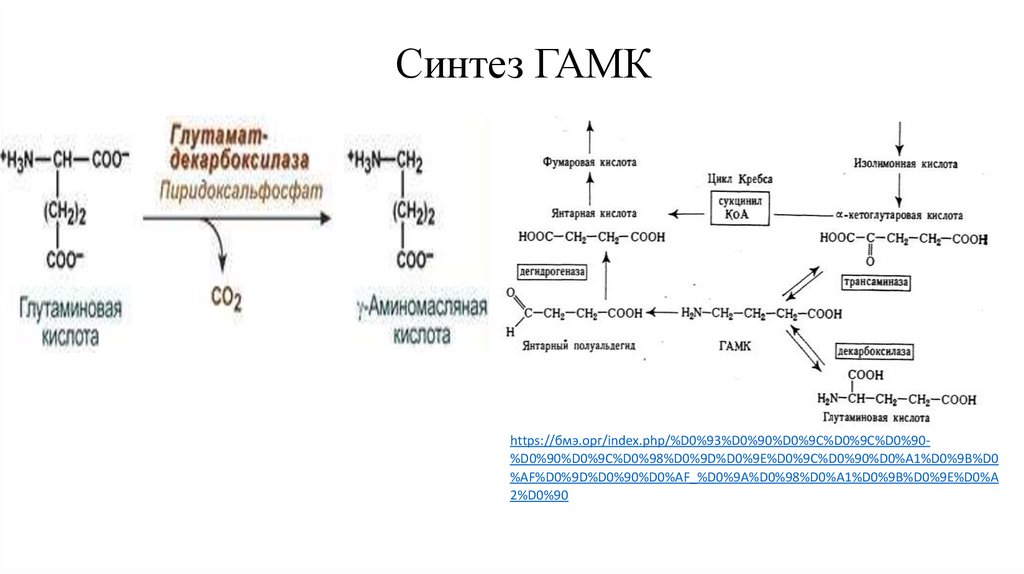 Синтез ГАМКhttps://бмэ.орг/index.php/%D0%93%D0%90%D0%9C%D0%9C%D0%90%D0%90%D0%9C%D0%98%D0%9D%D0%9E%D0%9C%D0%90%D0%A1%D0%9B%D0