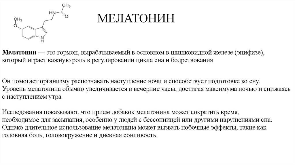 МЕЛАТОНИНМелатонин — это гормон, вырабатываемый в основном в шишковидной железе (эпифизе),