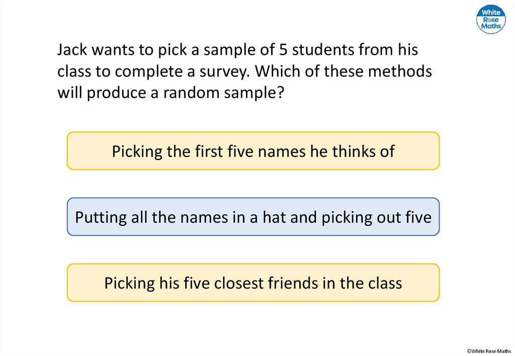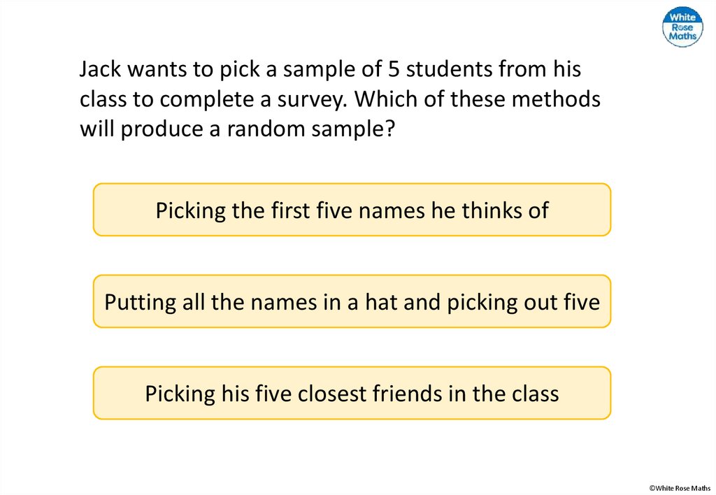 Jack wants to pick a sample of 5 students from hisclass to complete a survey. Which of these methods