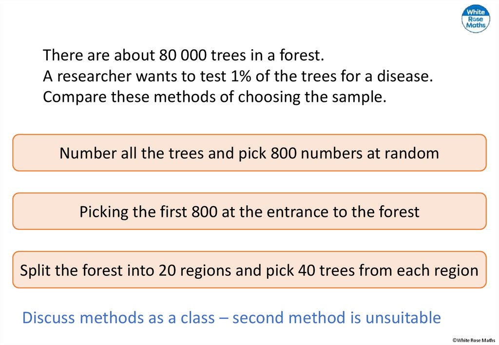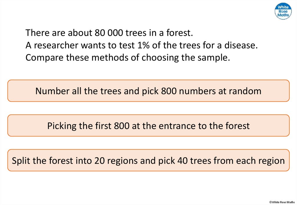 There are about 80 000 trees in a forest.A researcher wants to test 1% of the trees for a disease.