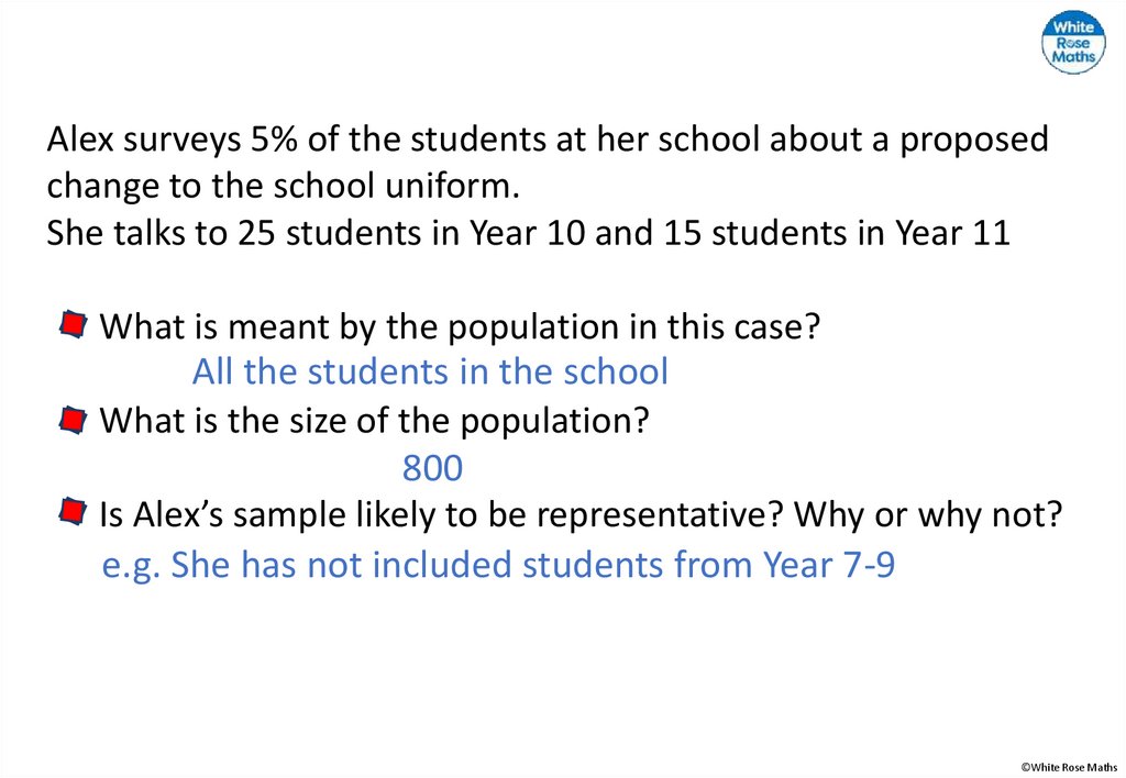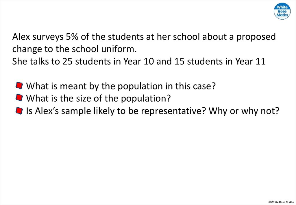 Alex surveys 5% of the students at her school about a proposedchange to the school uniform.