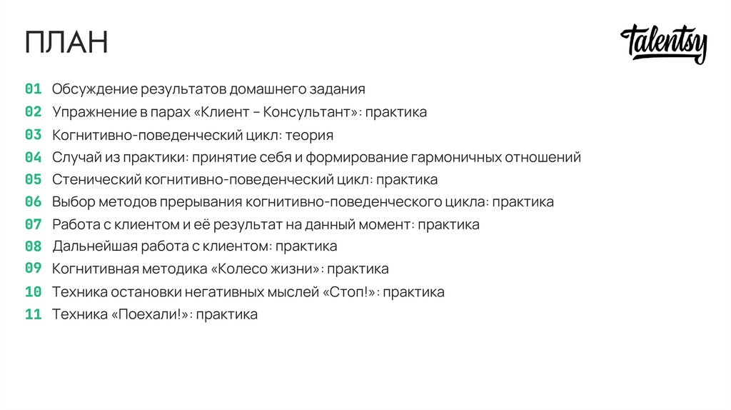 01 Обсуждение результатов домашнего задания02 Упражнение в парах «Клиент – Консультант»: практика