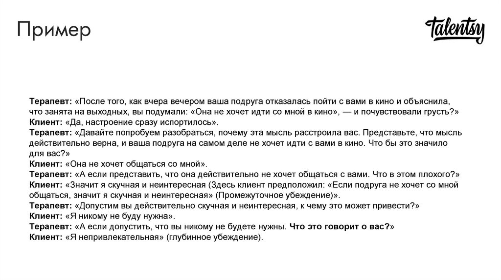 Терапевт: «Давайте разберемся, почему эта ситуация вызывает у вас грусть. Если предположить, что подругадействительно не хочет идти с вами в кино, то что это значит для вас?»