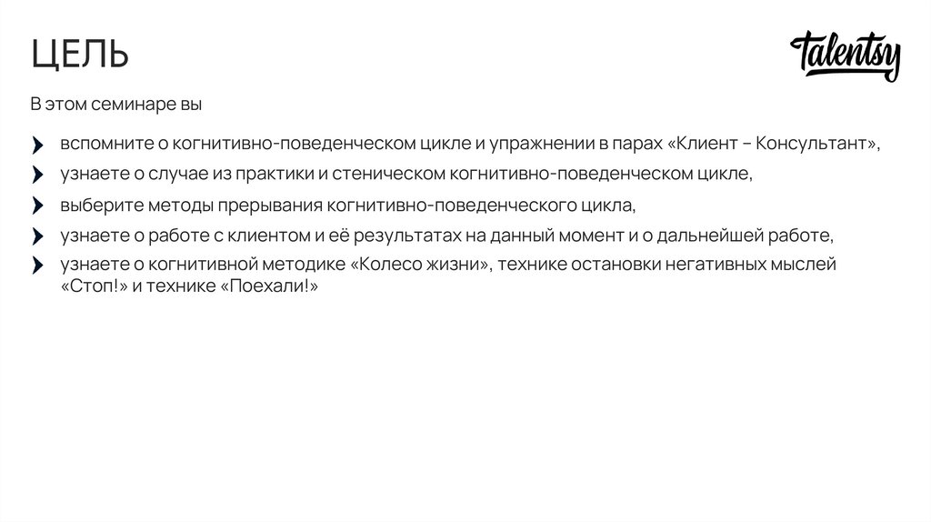 В этом семинаре вывспомните о когнитивно-поведенческом цикле и упражнении в парах «Клиент – Консультант»,