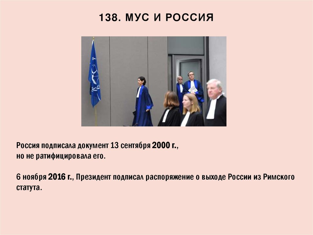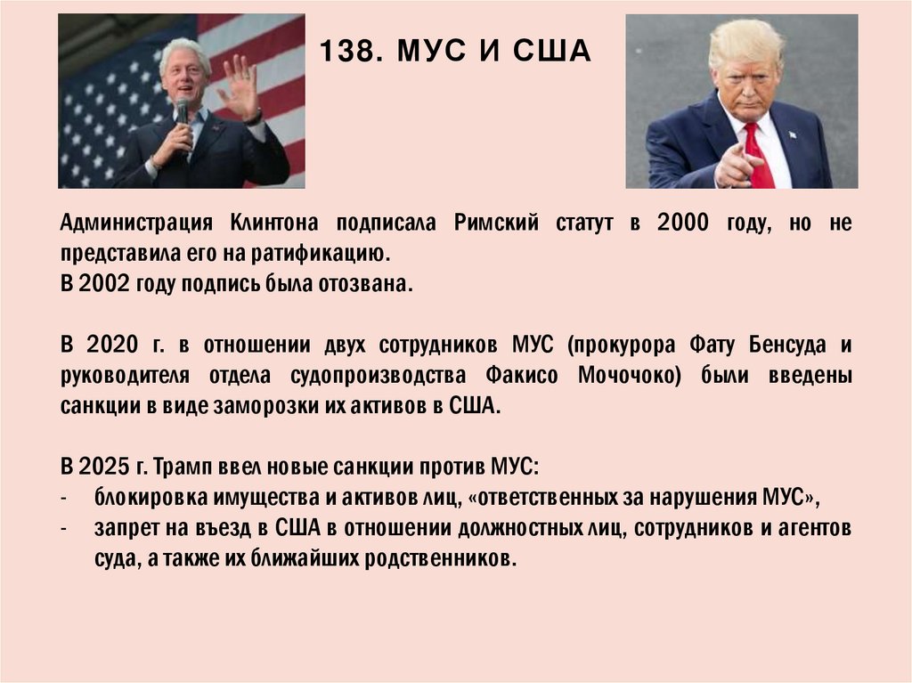 138. МУС И СШААдминистрация Клинтона подписала Римский статут в 2000 году, но не