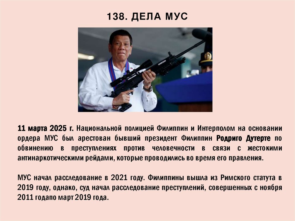 11 марта 2025 г. Национальной полицией Филиппин и Интерполом на основанииордера МУС был арестован бывший президент Филиппин Родриго Дутерте по