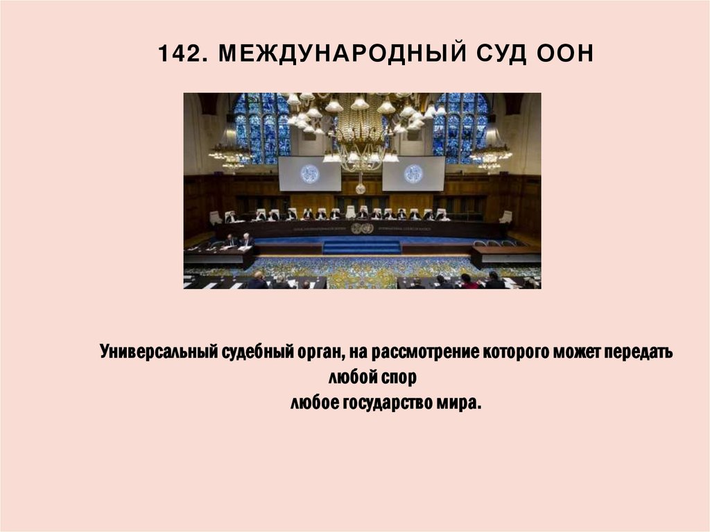 142. МЕЖДУНАРОДНЫЙ СУД ООНУниверсальный судебный орган, на рассмотрение которого может передать