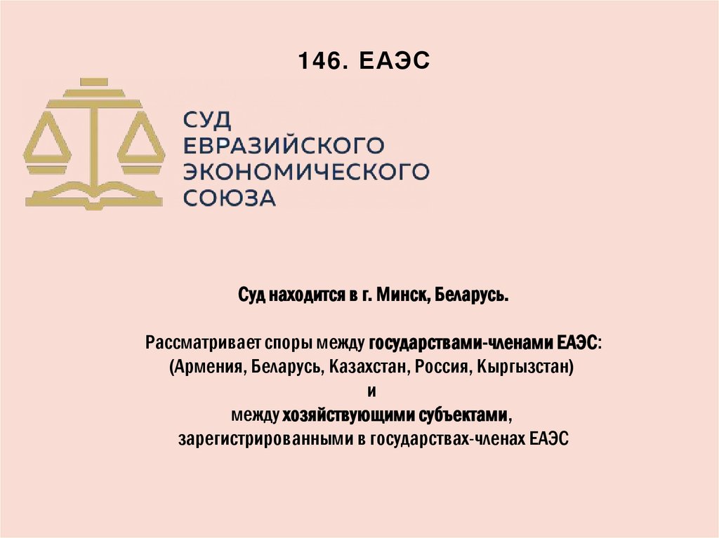 Суд находится в г. Минск, Беларусь.Рассматривает споры между государствами-членами ЕАЭС: