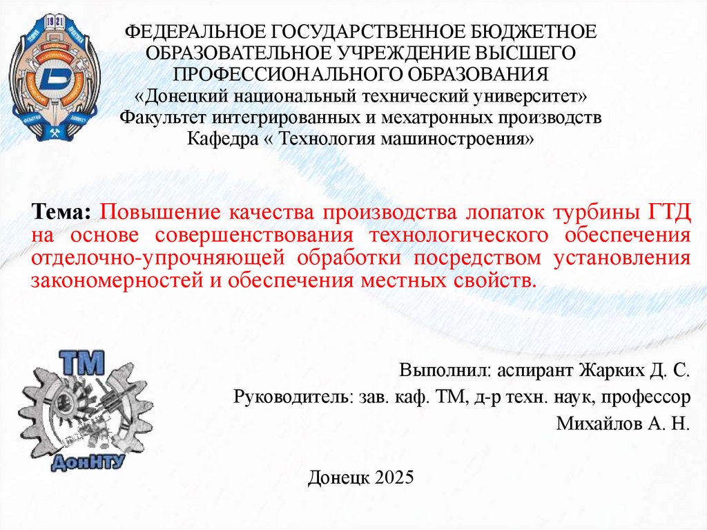 Тема: Повышение качества производства лопаток турбины ГТД на основе совершенствования технологическогообеспечения отделочно-упрочняющей обработки посредством установления закономерностей и обеспечения