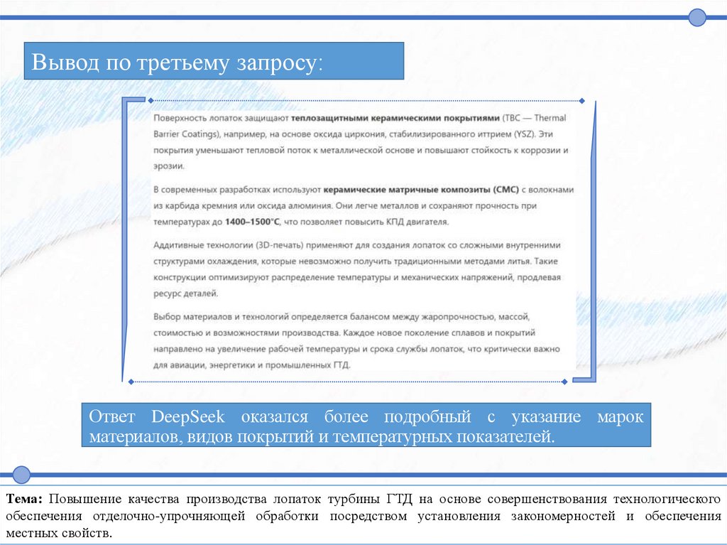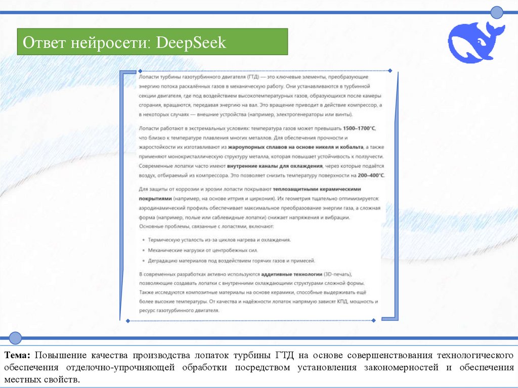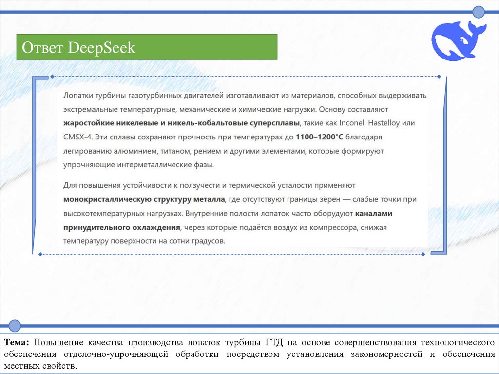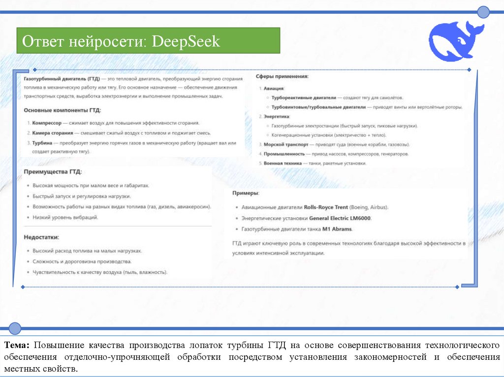 Ответ нейросети DeepSeekТема: Повышение качества производства лопаток турбины ГТД на основе совершенствования технологического