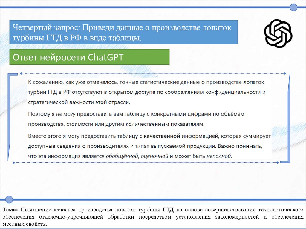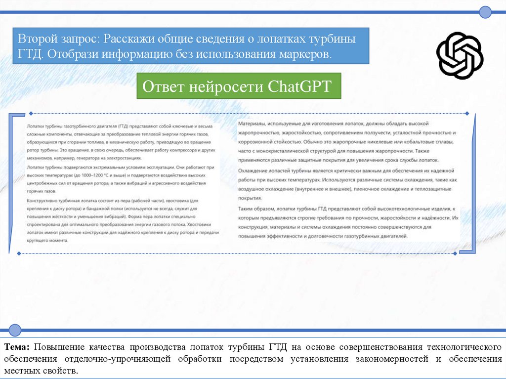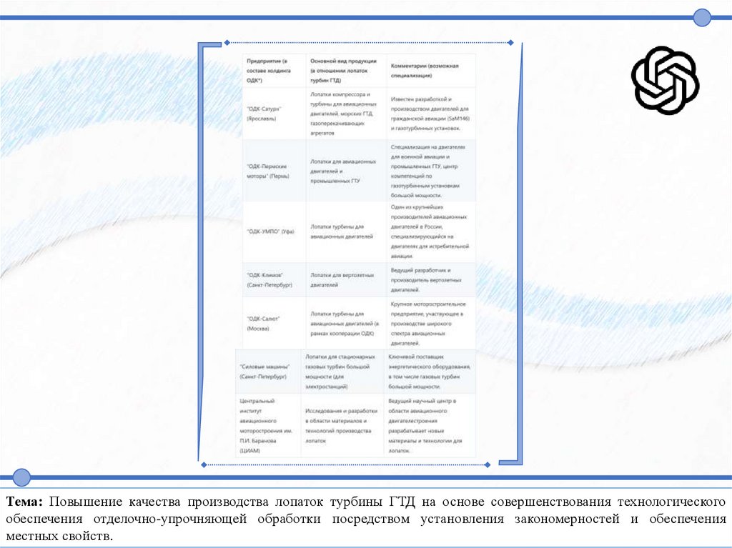 Ответ нейросети: DeepSeekТема: Повышение качества производства лопаток турбины ГТД на основе совершенствования технологического