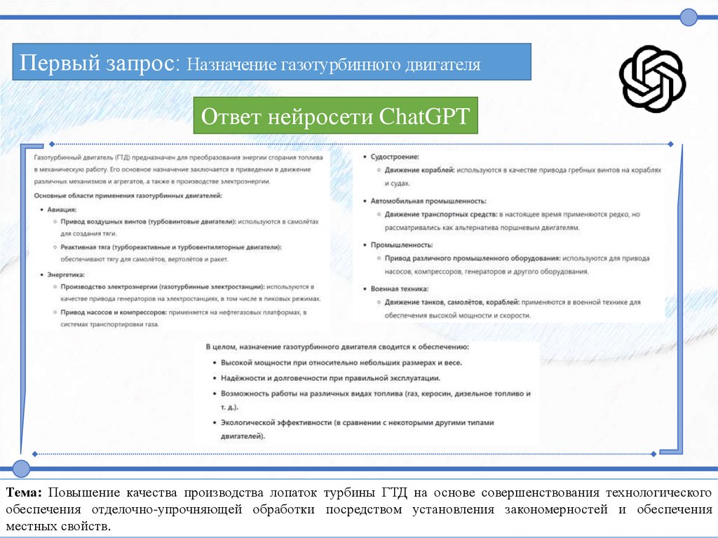 Первый запрос: Назначение газотурбинного двигателяОтвет нейросети ChatGPT