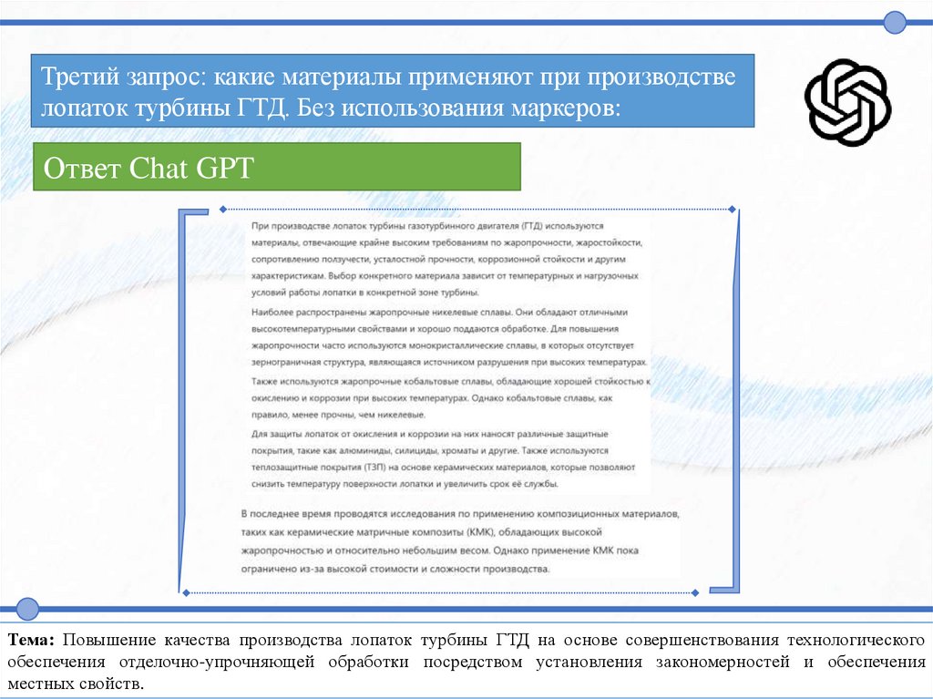 Третий запрос: какие материалы применяют при производствелопаток турбины ГТД. Без использования маркеров: