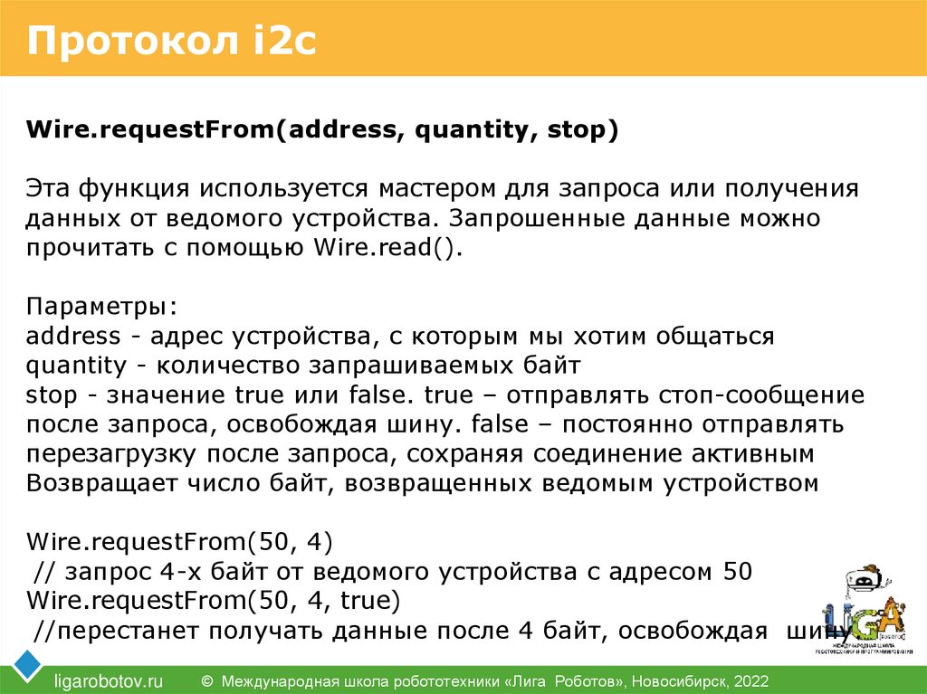 Протокол i2cWire.requestFrom(address, quantity, stop)