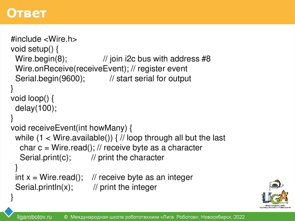 Wire.begin(8); //инициализируем I2C шину с адресов #8
