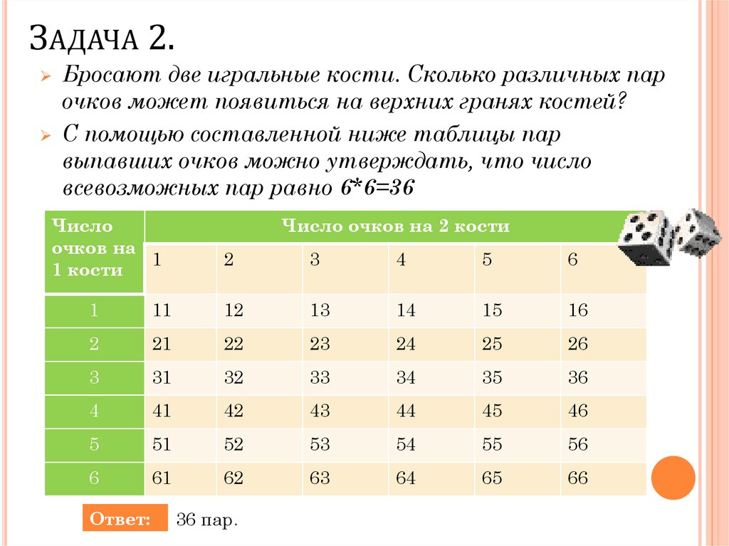 ЗАДАЧА 2.Бросают две игральные кости. Сколько различных пар