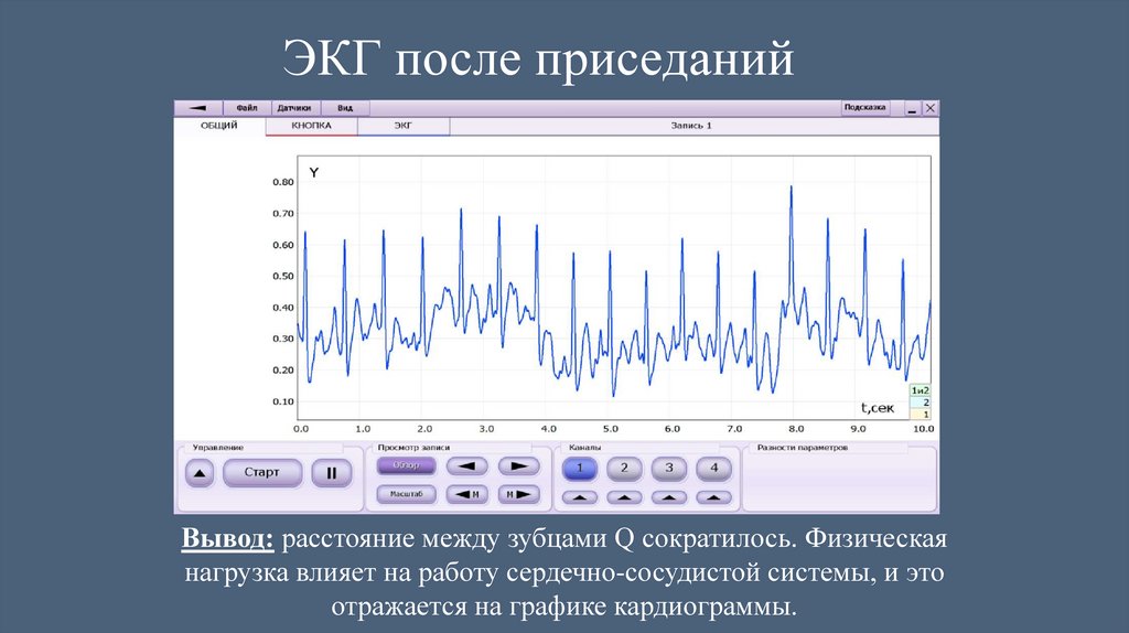 ЭКГ после приседанийВывод: расстояние между зубцами Q сократилось. Физическая