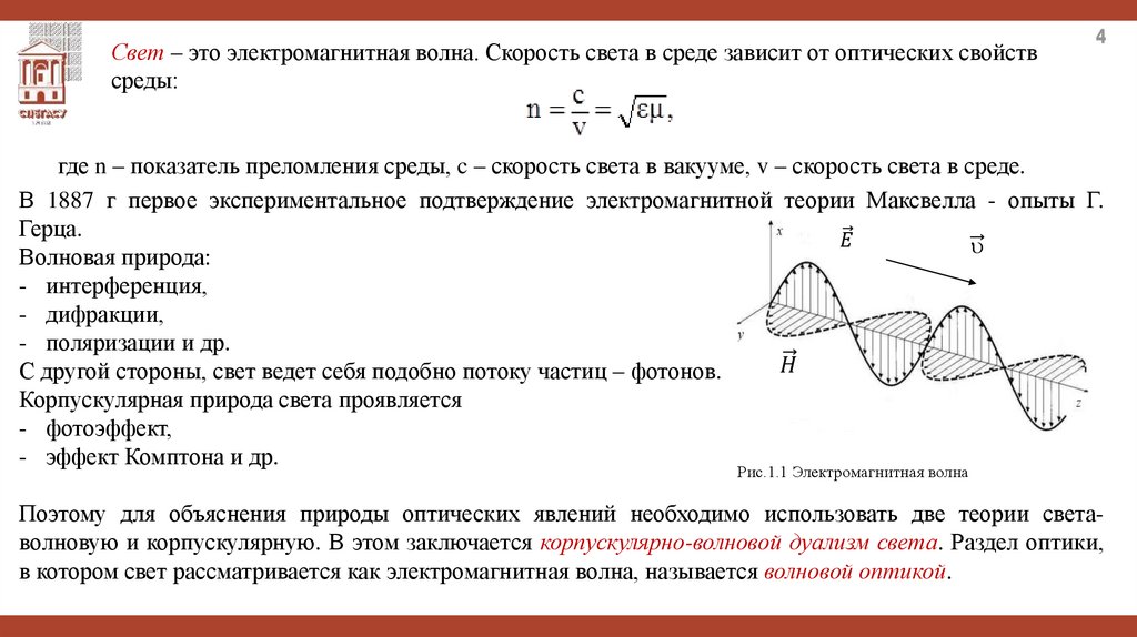 Свет – это электромагнитная волна. Скорость света в среде зависит от оптических свойствсреды: