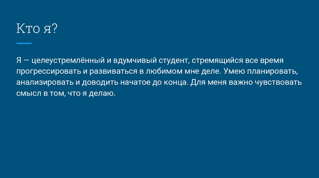 Кто я?Я — целеустремлённый и вдумчивый студент, стремящийся все время