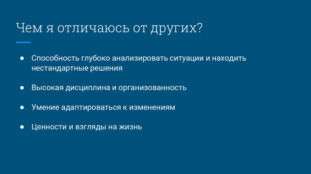 Чем я отличаюсь от других?● Способность глубоко анализировать ситуации и находить