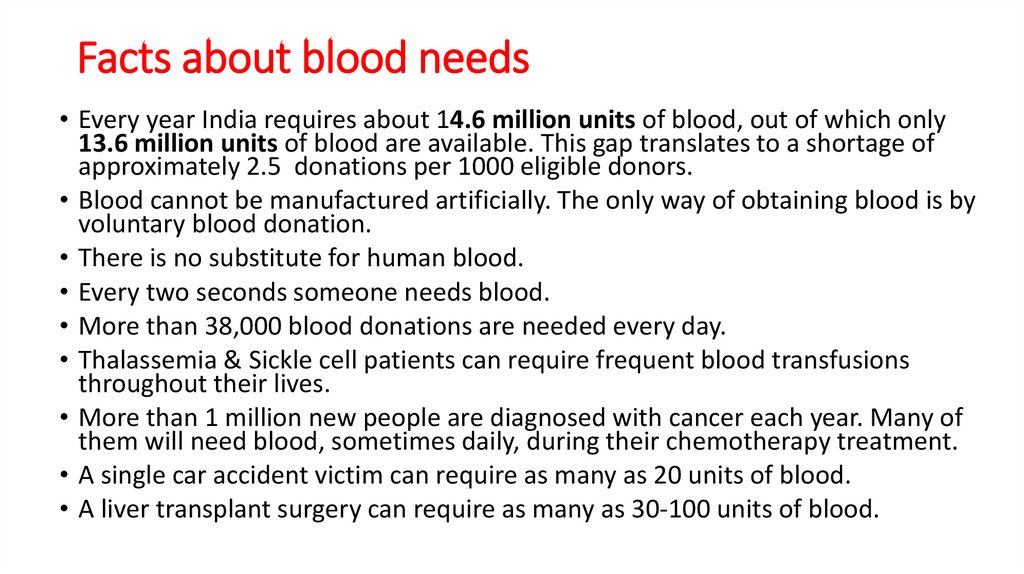 • Every year India requires about 14.6 million units of blood, out of which only13.6 million units of blood are available. This gap translates to a shortage of