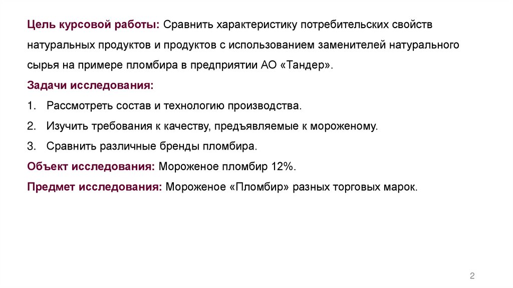 Цель курсовой работы: Сравнить характеристику потребительских свойствнатуральных продуктов и продуктов с использованием заменителей натурального