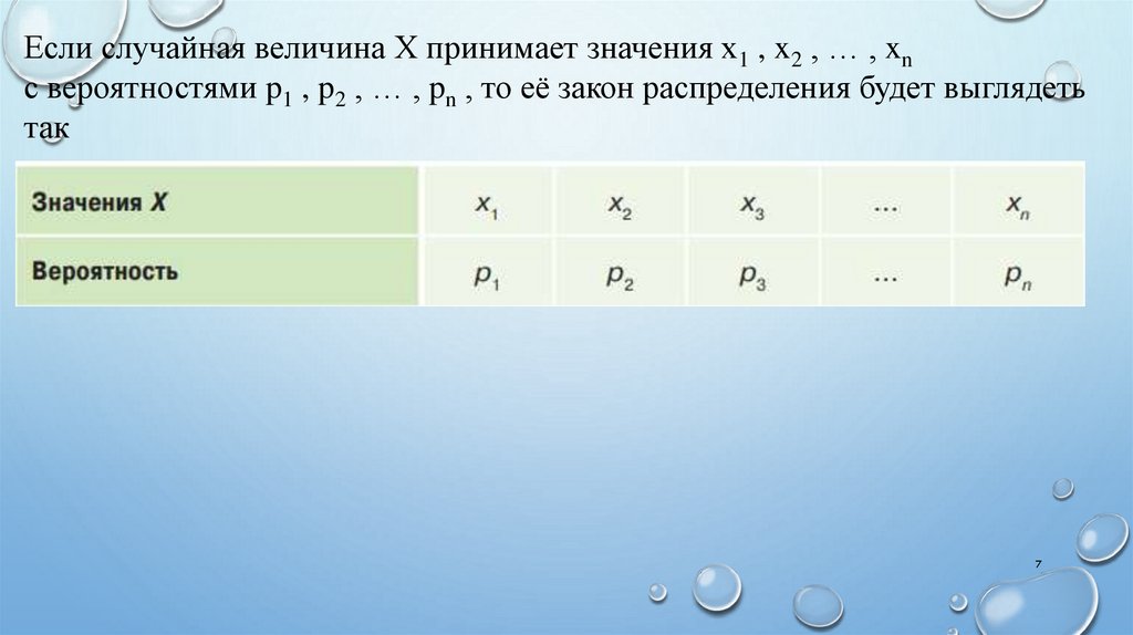 Если случайная величина X принимает значения x1 , x2 , … , xnс вероятностями p1 , p2 , … , pn , то её закон распределения будет выглядеть