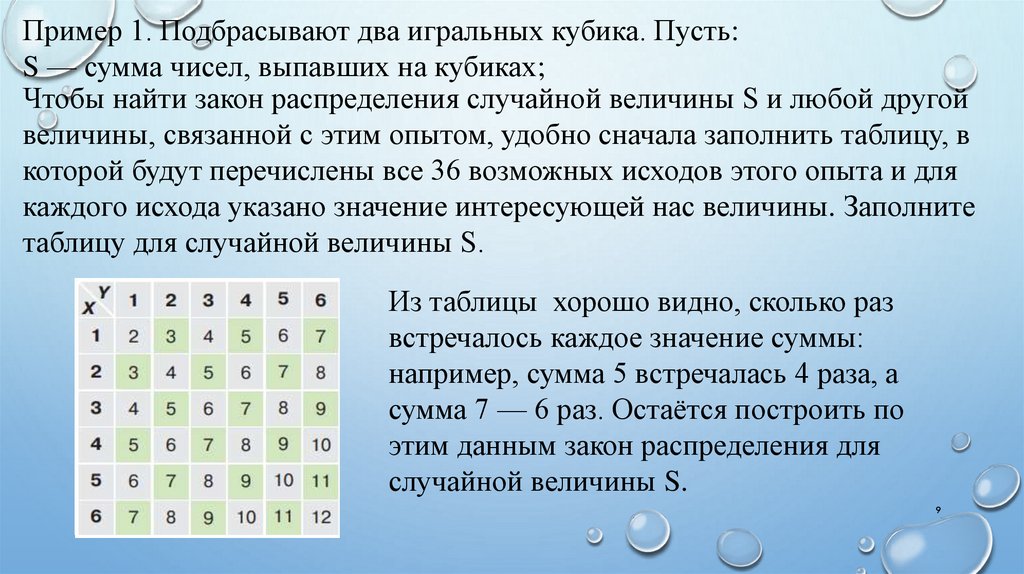 Пример 1. Подбрасывают два игральных кубика. Пусть:S — сумма чисел, выпавших на кубиках;