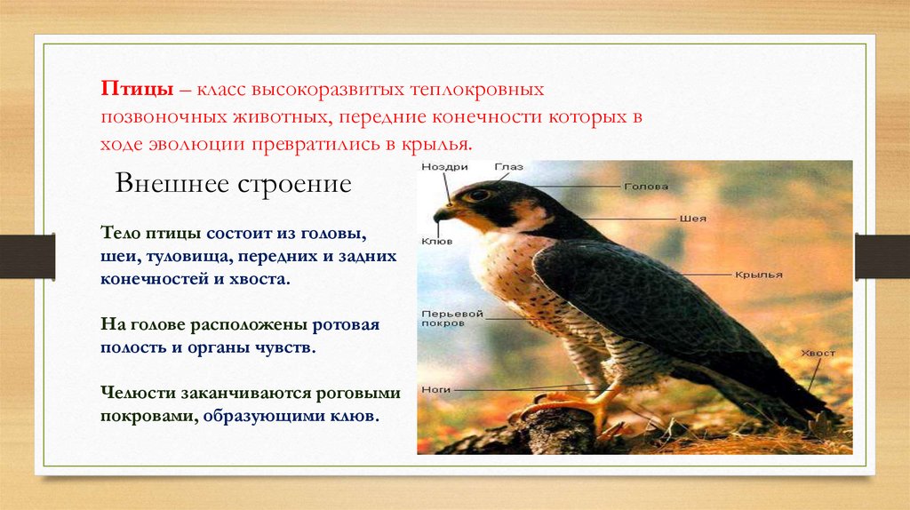 Птицы – класс высокоразвитых теплокровныхпозвоночных животных, передние конечности которых в