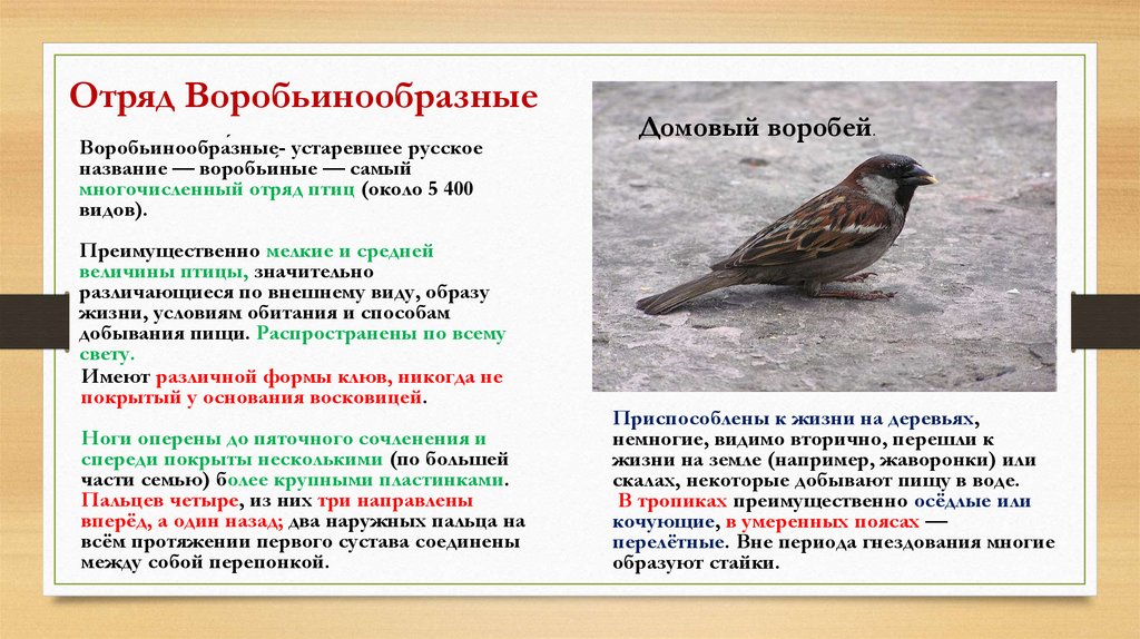 Отряд ВоробьинообразныеВоробьинообра́зные- устаревшее русское