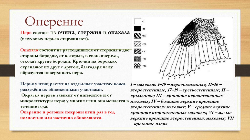 Перья у птиц растут на отдельных участках кожи, I – маховые: 1–10 – первостепенные, 11–16 –
