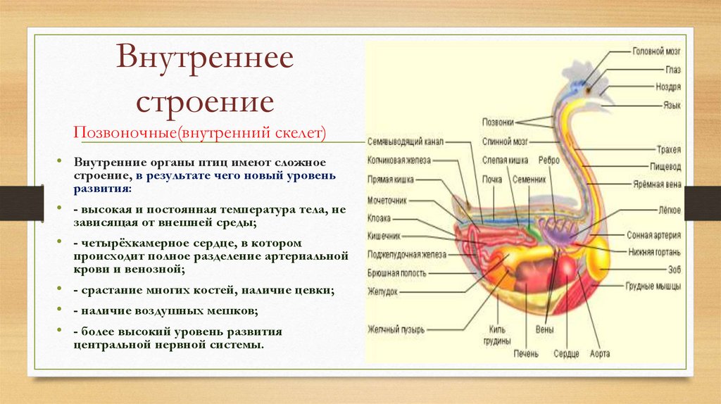 Позвоночные(внутренний скелет)• Внутренние органы птиц имеют сложное