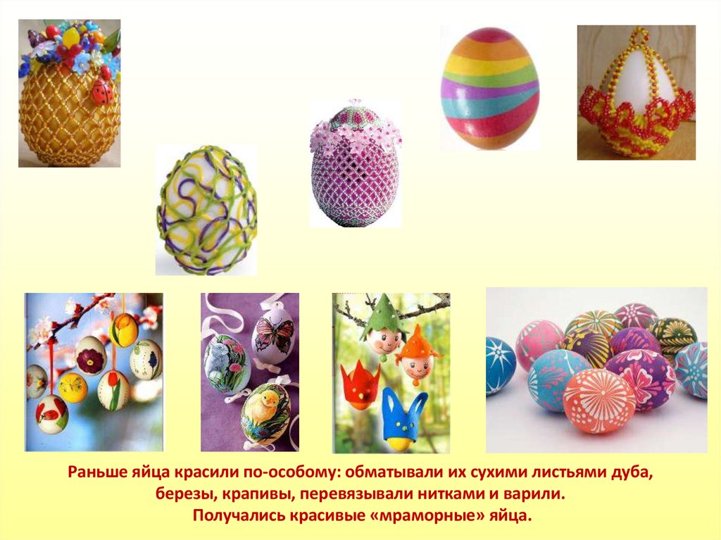 Раньше яйца красили по-особому: обматывали их сухими листьями дуба,березы, крапивы, перевязывали нитками и варили.